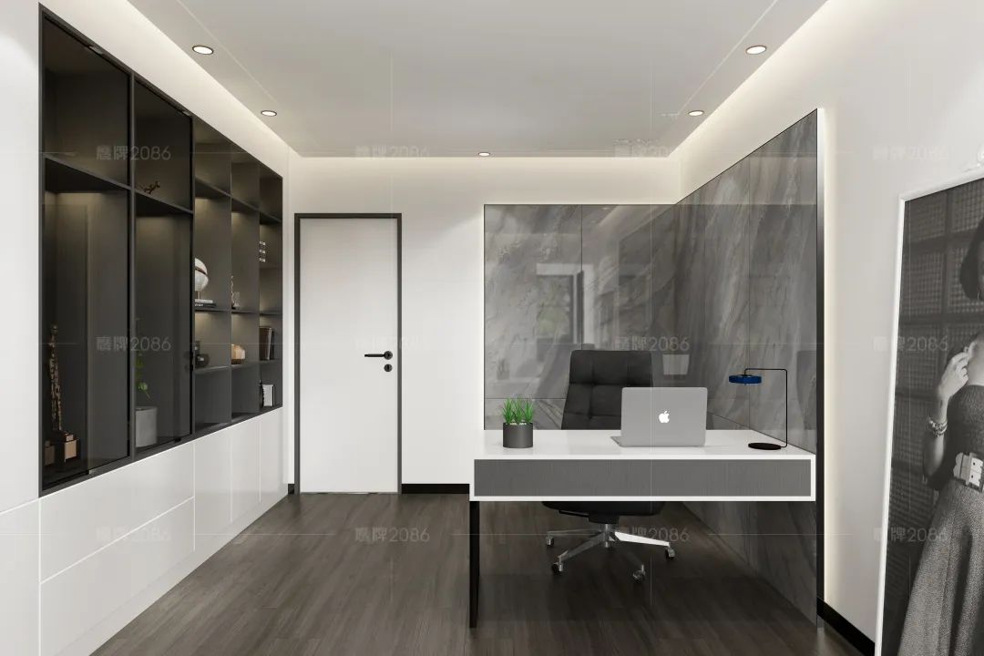 几块纹理独特的灰蓝奢石隔出静谧又独特的阅读空间,黑白对比的整墙柜体保证书房的实用性和收纳空间,以薄墙来隔离书房和阳台,扩大空间并增强采光,左右两边留出适当空间以保持对称美,做内嵌推拉门,维持动线的流畅。