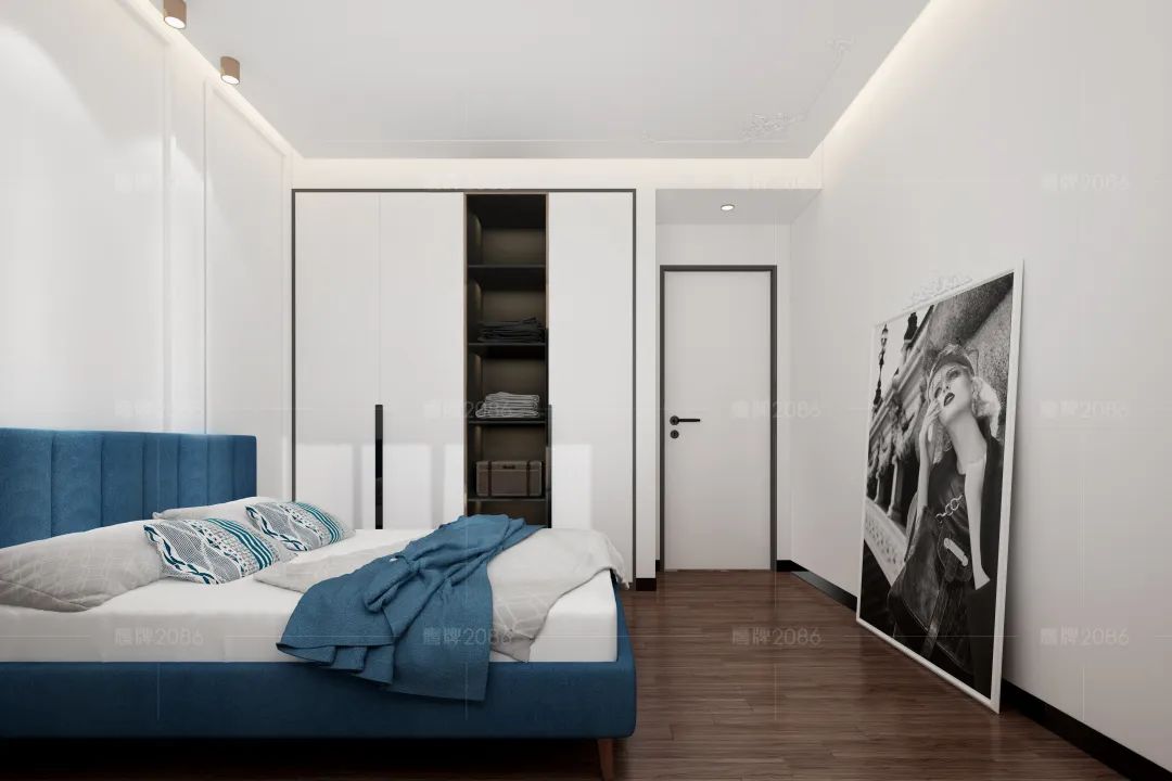 内嵌柜体实用又美观,几条简约的背景线,与客厅呼应的欧式雕花,一片宁静雅奢中蓝色床品让人眼前一亮,欧式大挂画随意的摆在墙边,又带出一点随性。