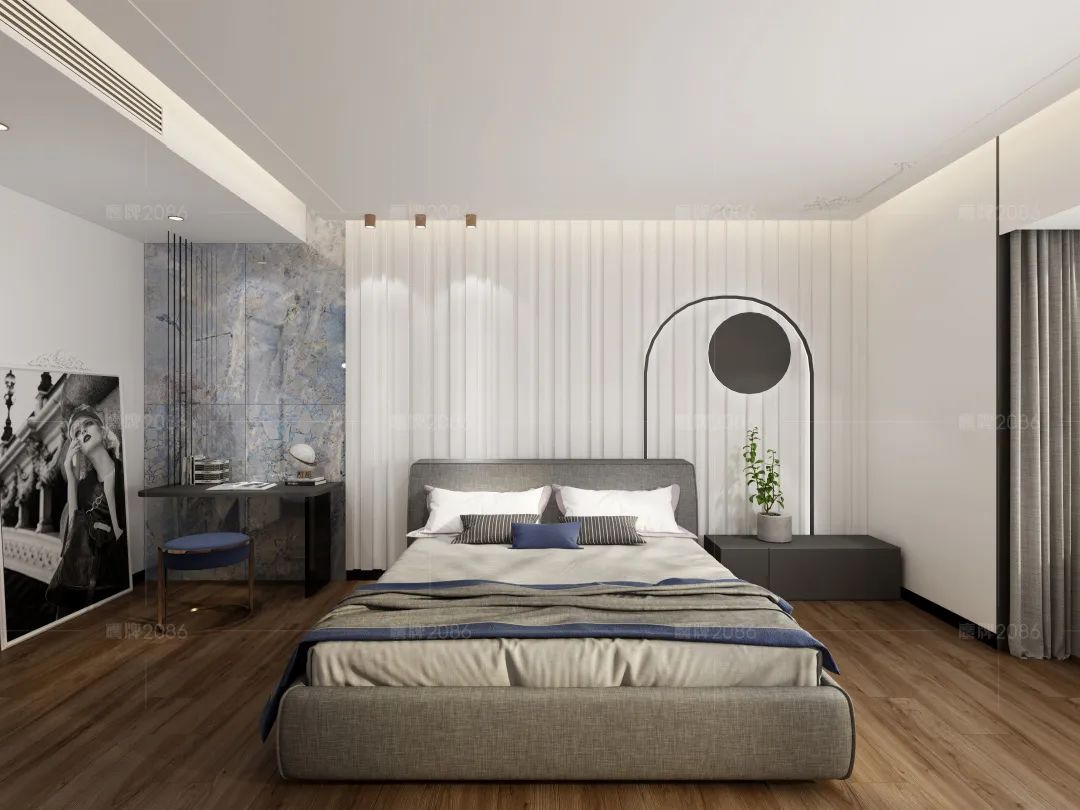 在大面积白色的主卧里,蓝色的加入分外显眼,格栅元素的床头设计,打破了纯色空间中的单调,带来了一丝柔美与梦幻。贴着墙边定制了书桌,让文化与知识的气息伴随着自然奢石在室内涌动。