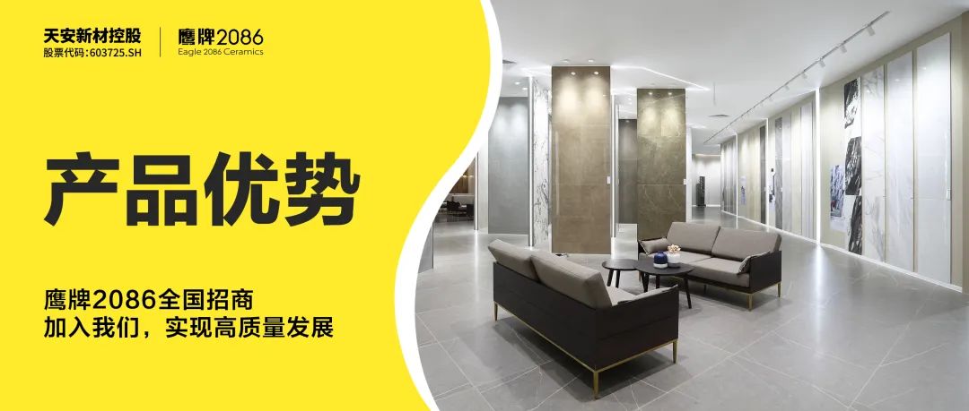 瓷砖一线品牌鹰牌2086作为鹰牌集团旗下高端现代砖品牌,继承鹰牌48年研发生产经验与品质,走在建陶行业流行趋势最前沿,坚持原创设计,围绕“功能性、设计感、文化使命、健康环保、高端美学”五大核心理念,打造10大瓷砖系列、15种规格、超350款全品类产品体系,以特色化、渠道差异化的原则构建产品阵容,满足零售、设计师、整装、工装、工程等全渠道产品需求。