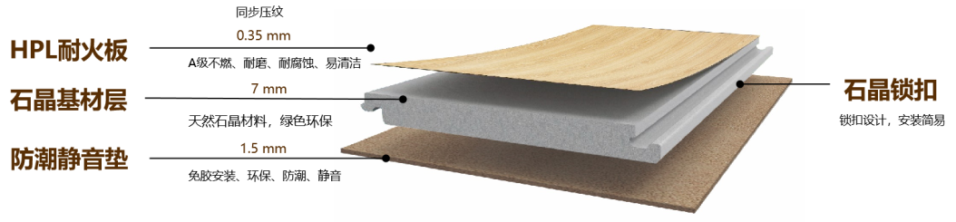 HPL石晶地板:是由高科技的防水无醛石晶基材及HPL防火板与装饰纸层组合而成,是国内原创、拥有超高性能的新型防火地面装饰材料,其采用天然的大理石粉构成高密度、高纤维网状结构的坚实基层,表面覆以纹理清晰立体的装饰纸层,防火板层的添加让地板拥有阻燃、耐磨、耐烟头烫伤和耐刻划性能。