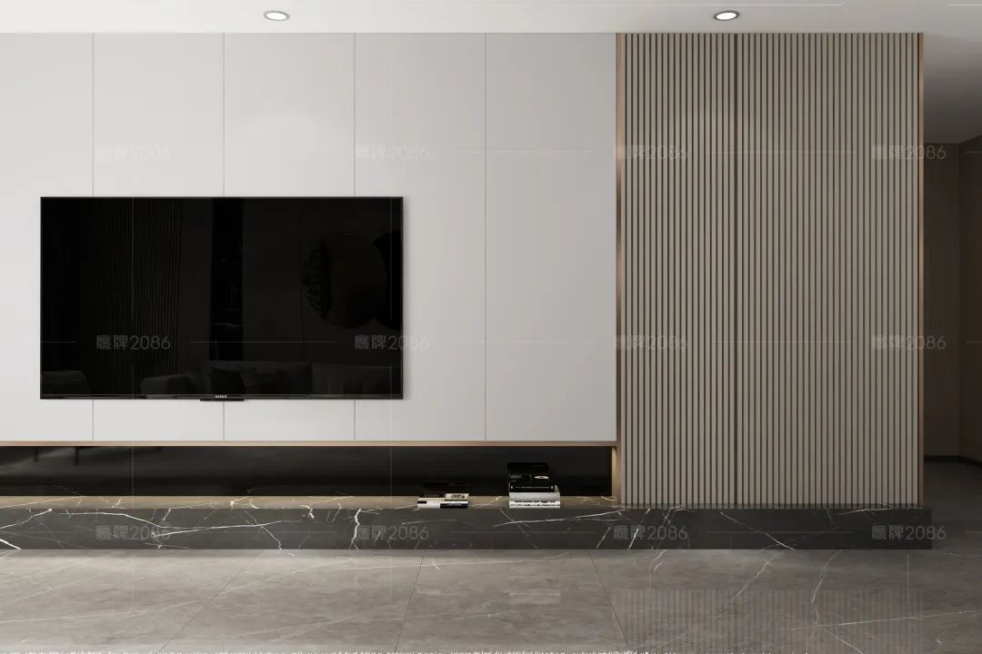 电视背景墙:肤感平面护墙板+木纹长城造型板
