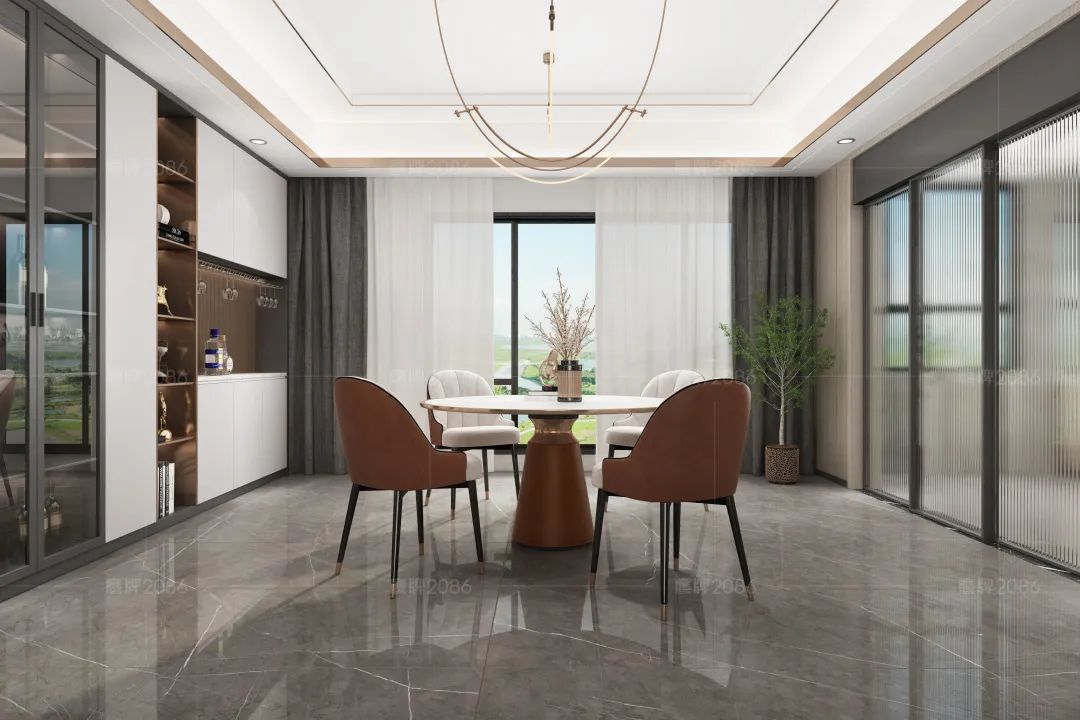 餐厅的设计,依然秉承着生活至上的原则;选用圆桌,能容纳更多的人用餐,亦能拉近家人之间的距离,更加适合中式的家庭关系;餐边柜增加了空间收纳力的同时,也给居住者的生活提供更多的便捷。
