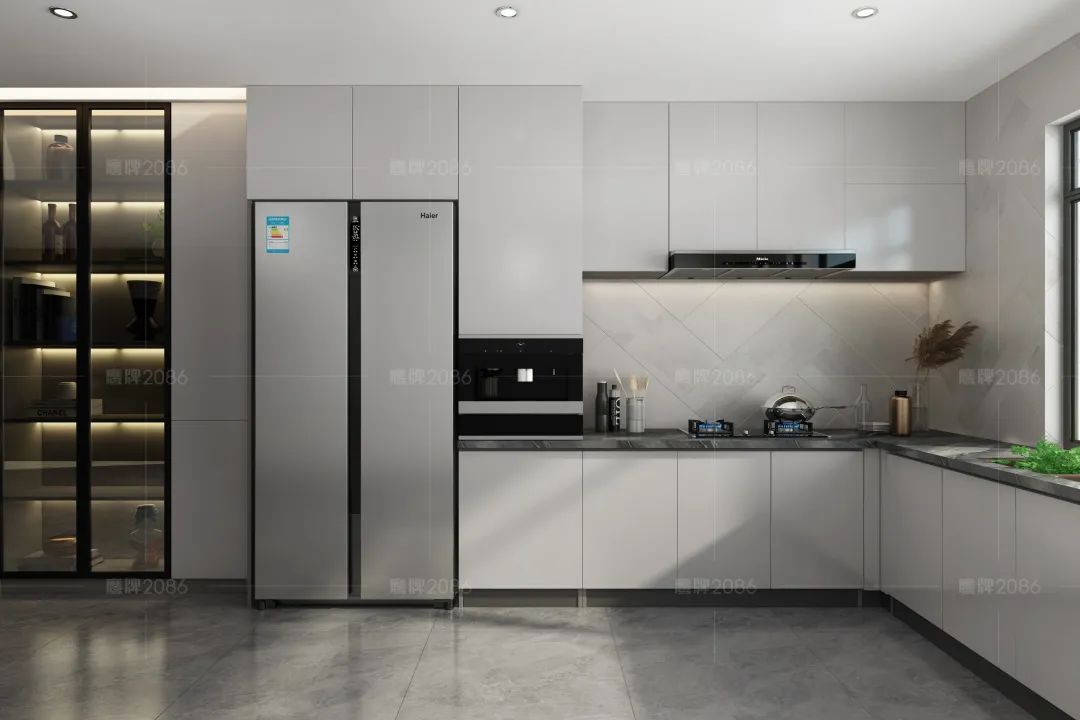 厨房采用全嵌入式,将油烟机、冰箱、烤箱等厨房电器全部收纳在柜体中,干净整洁,便于打扫。