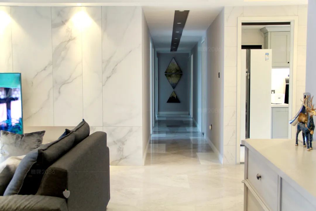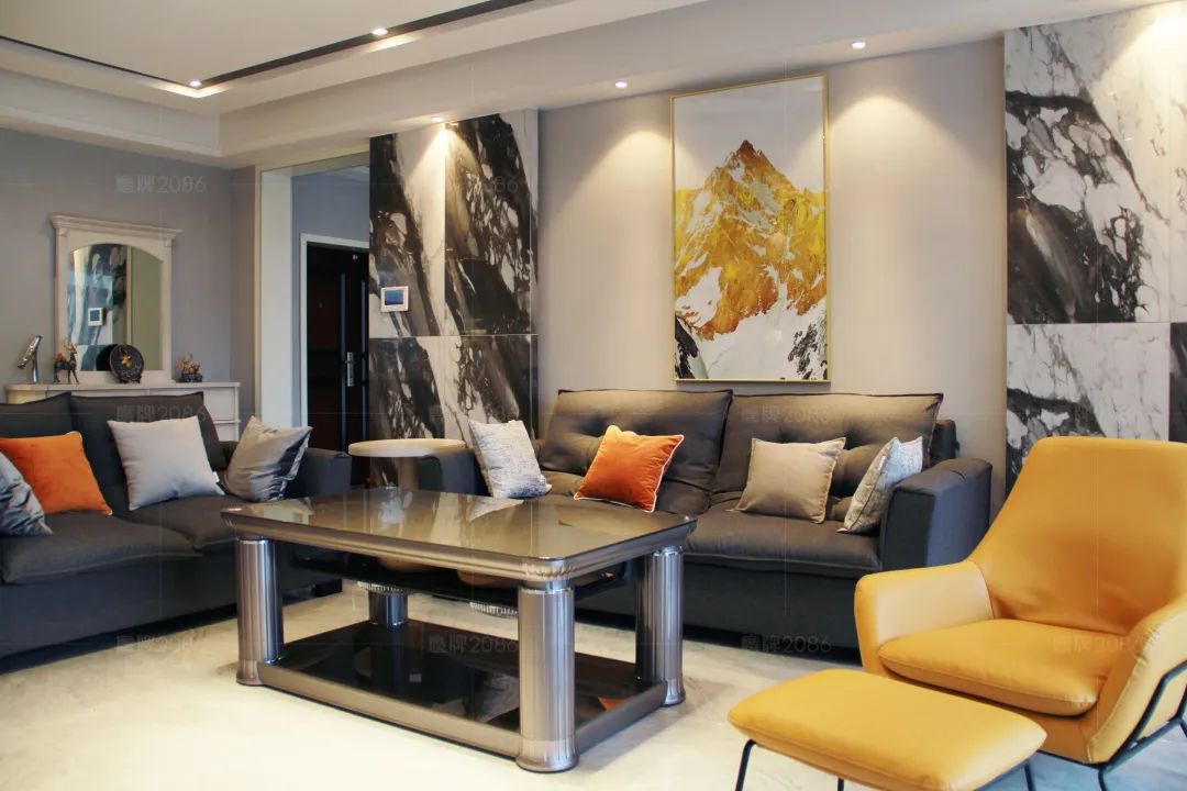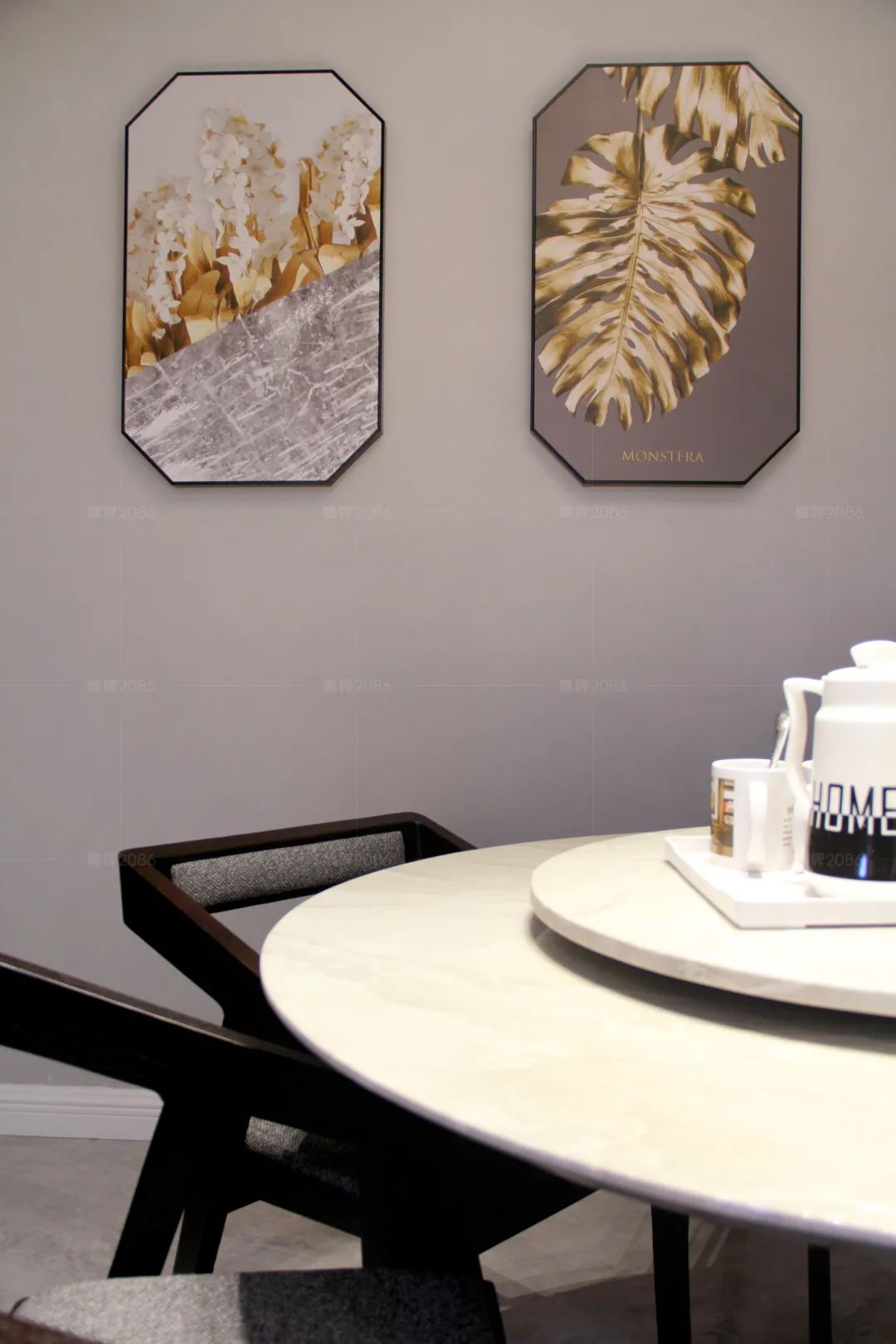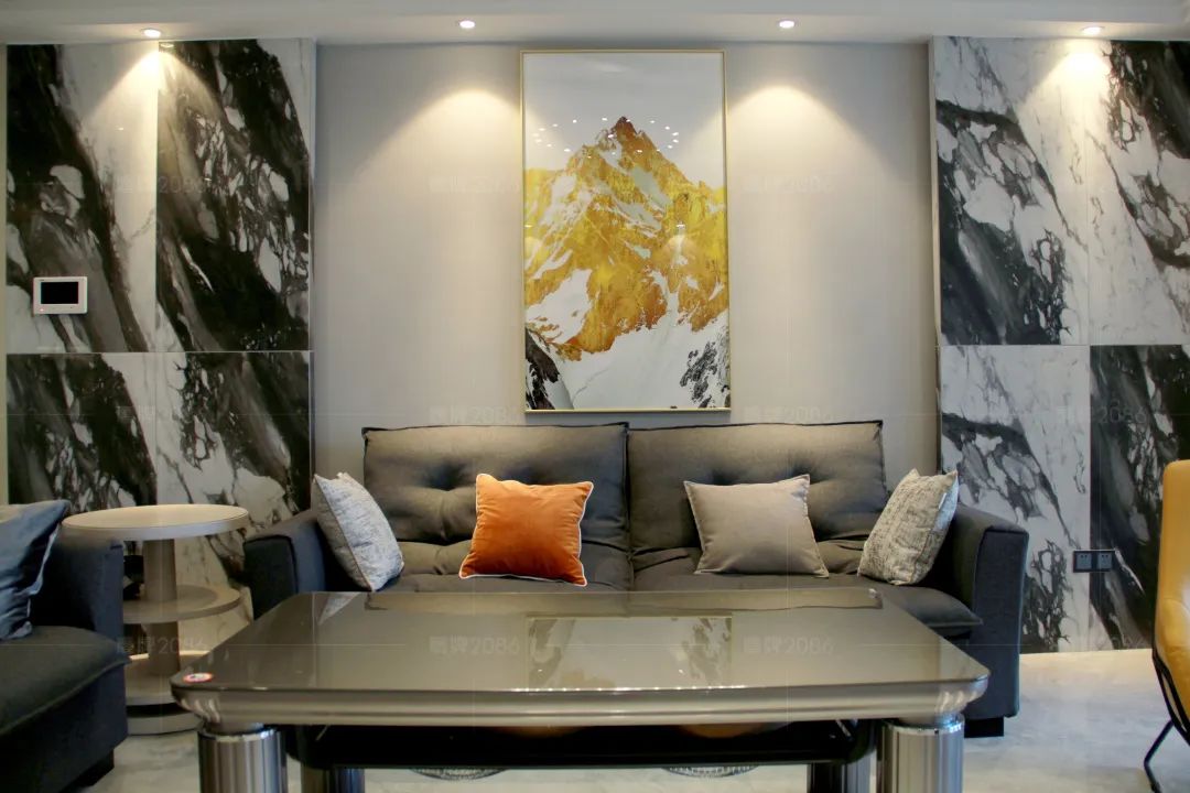 客厅的电视背景墙与沙发背景墙完美呼应,电视背景墙用“浩瀚之境”系列大板切割铺贴,简约大气,不会抢电视画面的焦点,视觉舒适;沙发背景墙则用具有泼墨感的产品进行呼应,雪山挂画与气势磅礴的背景相映成趣,彰显主人的处世哲学,低调谦逊,而又胸襟广阔。