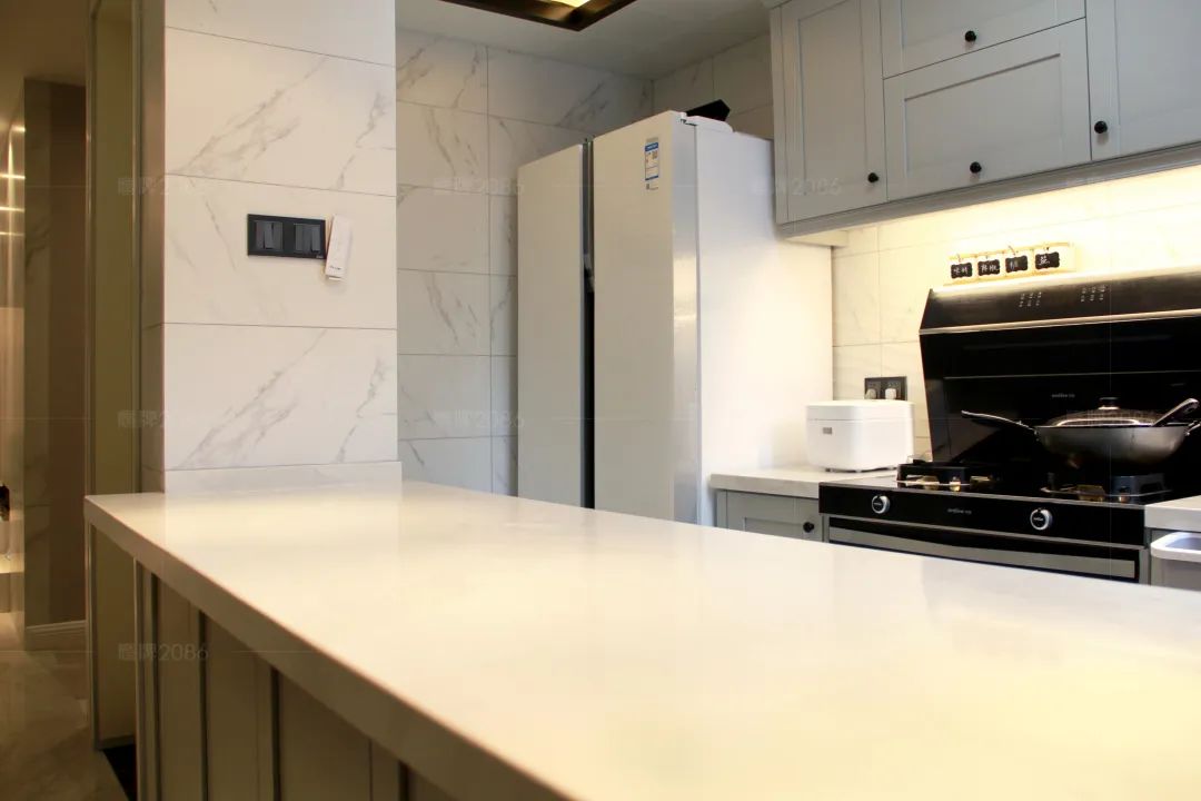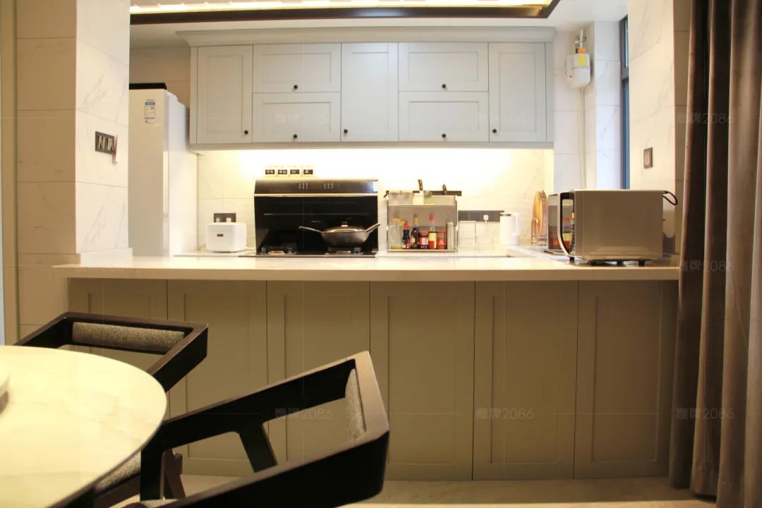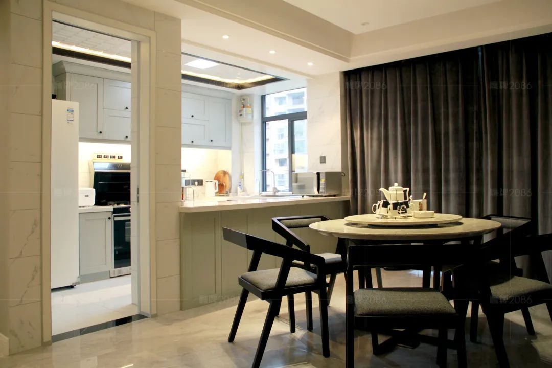 厨房采用半开放式与餐厅相连,空间通透且实用性强,在油盐酱醋中,体验生活百味,寻找人生乐趣。