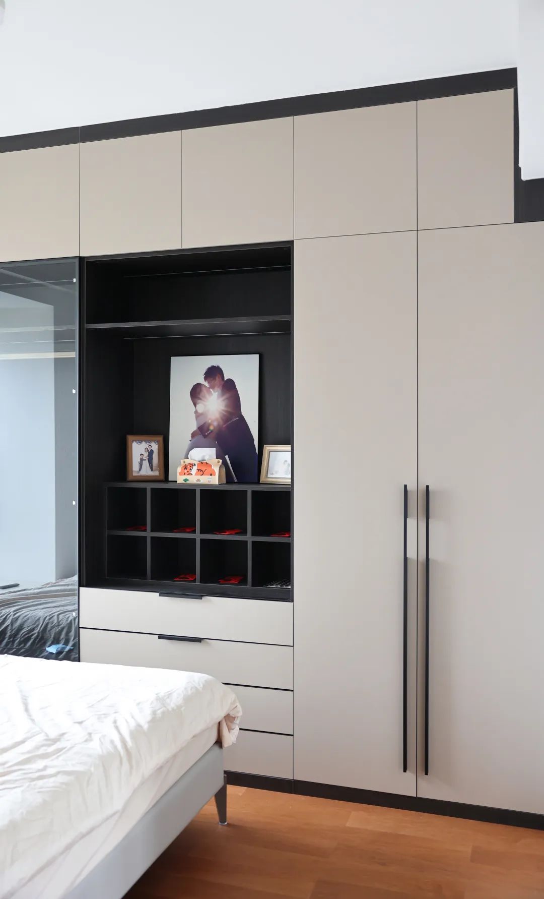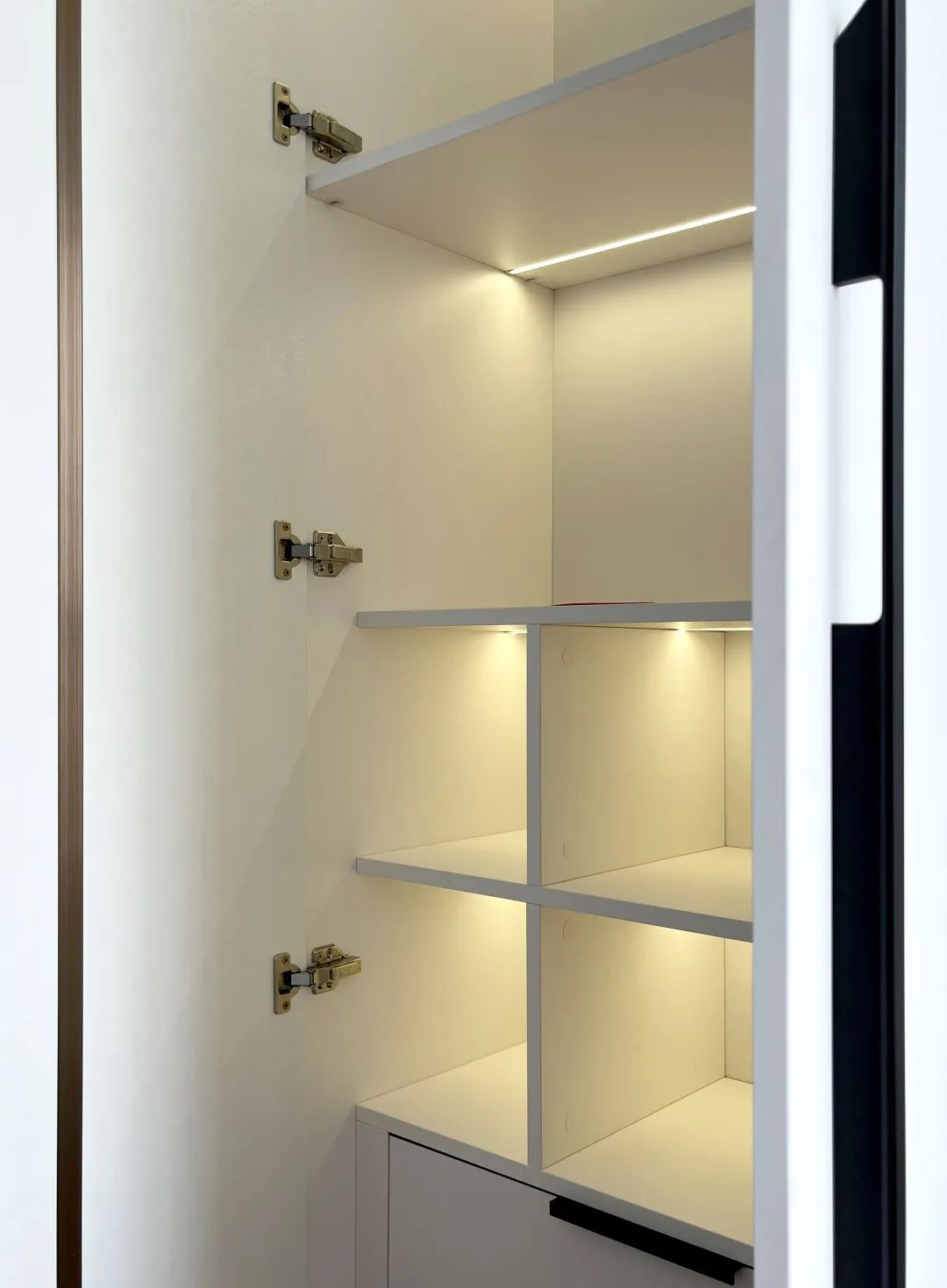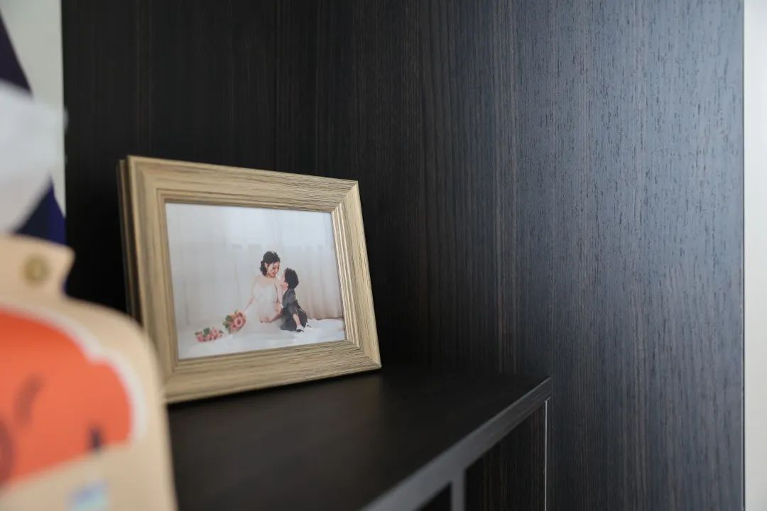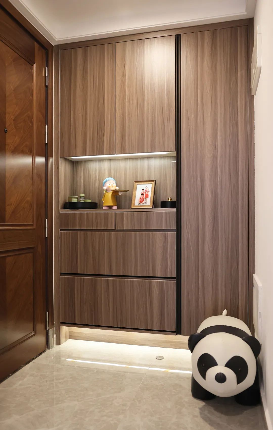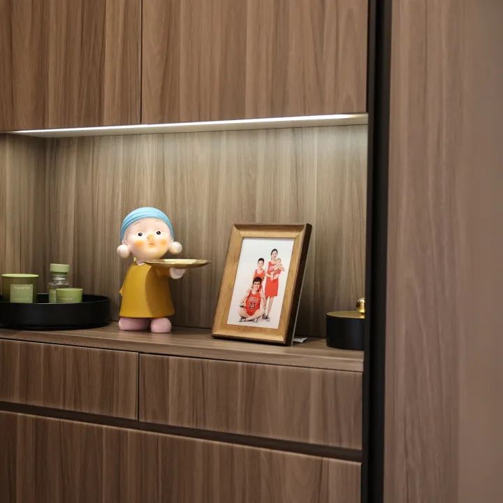 玄关定制柜为木纹肌理,自然又舒适,与整个空间完美搭配。隐藏式柜门拉手的设计,更显简洁大方。气味怡人的香薰、可爱别致的钥匙盘、和谐有爱的全家福整整齐齐地摆放在柜格上,加上灯带柔和光线的点缀,透露出主人家的精致与温馨。