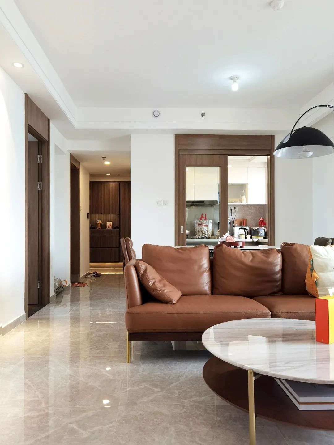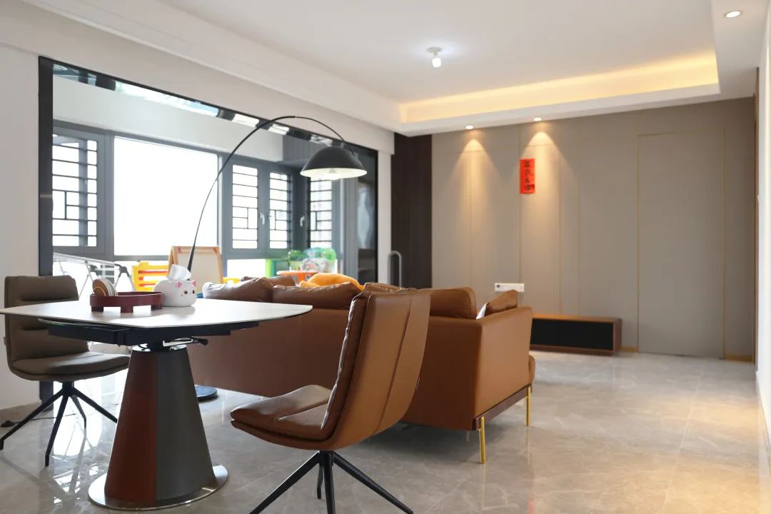 横厅户型的空间,橙色皮质沙发和餐椅成为亮点,加上一张雅白的岩板茶几,也让空间显得更加大气而高级。