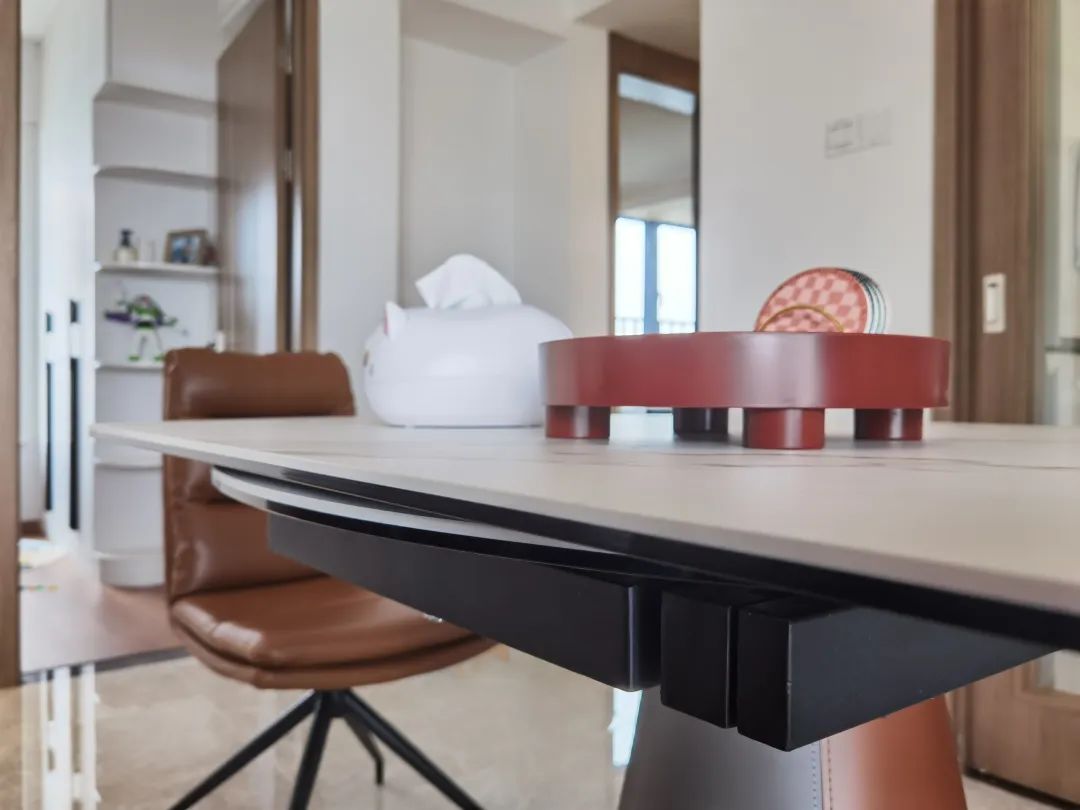 餐厅布置了一张大理石岩板旋转餐桌,满足不同人数用餐需求,摆放在现代舒适的空间下,百搭又耐脏。