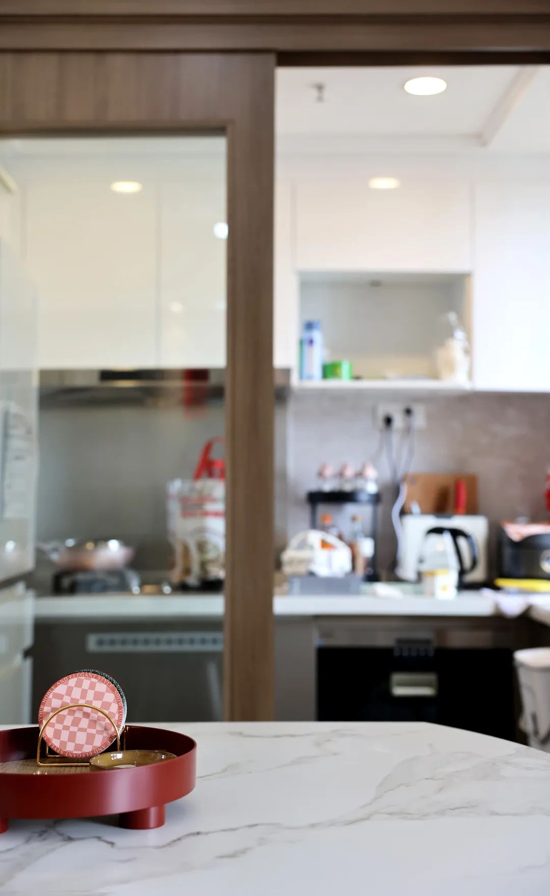 大面积的厨房推拉门在餐厅与厨房之间,透过玻璃推门可以看到厨房里面的情况,整体空间实用而又时尚大方。