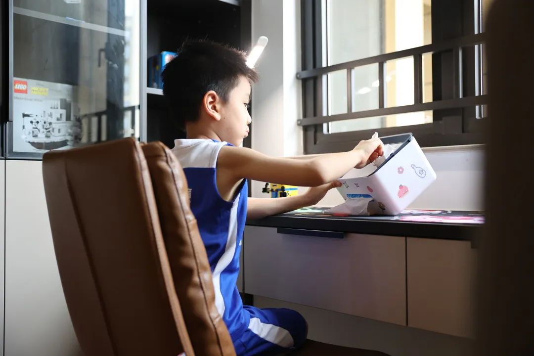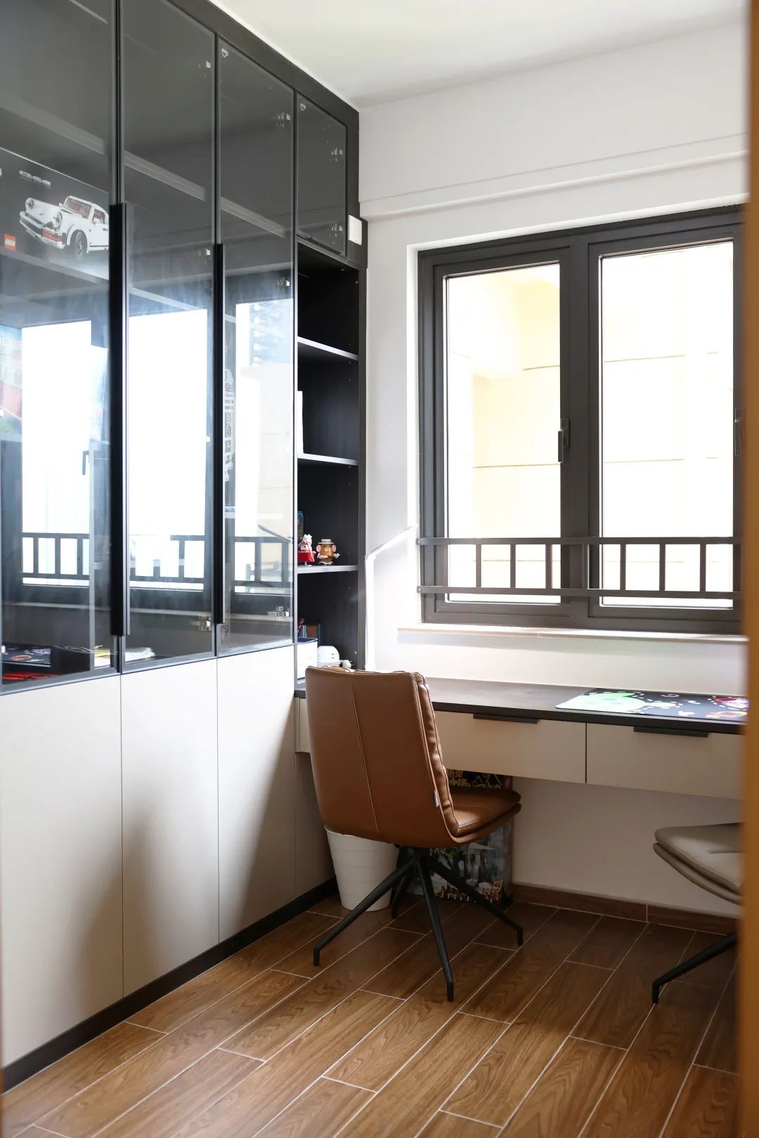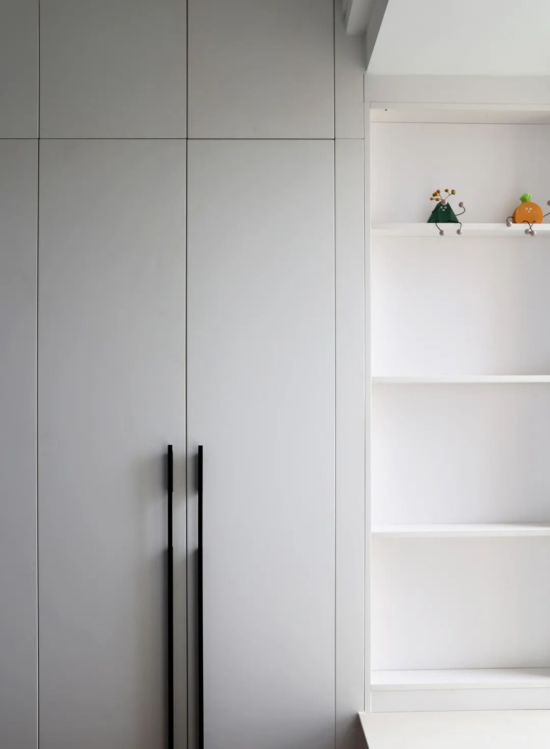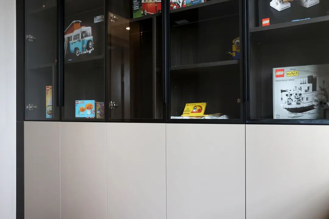 小小主人钟爱收藏手办与乐高,定制柜以书桌台面为界,上方为玻璃柜+展示柜,既能将精美的手办妥善保存避免积灰,也能将其展示在外,供人观赏;下方为白色
