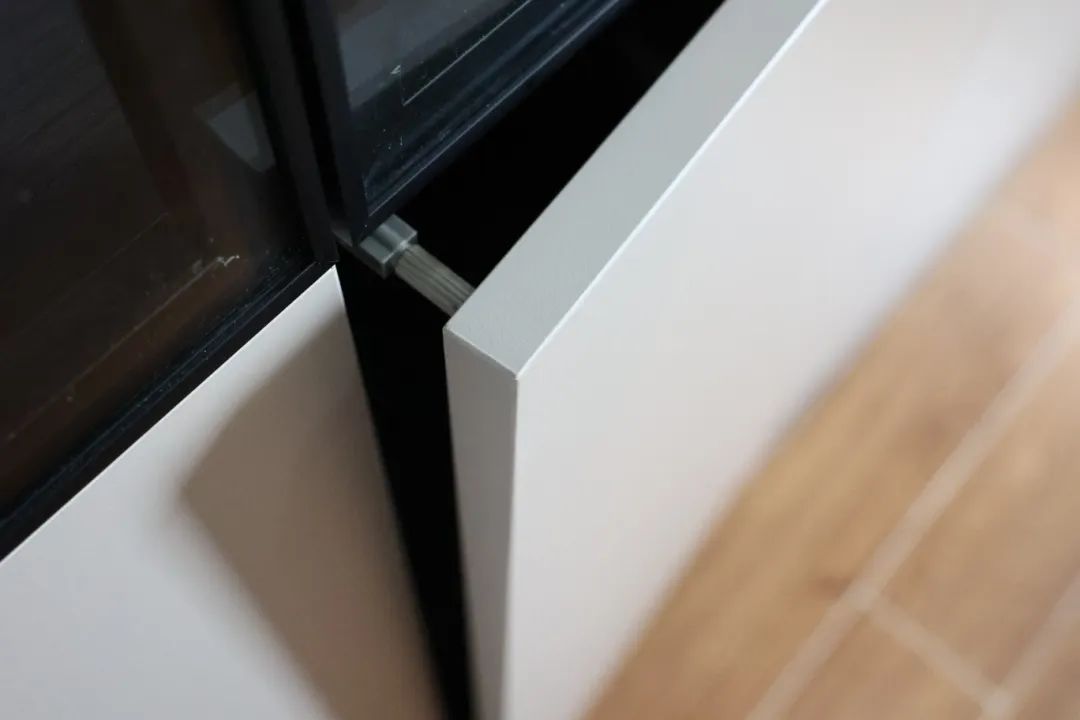 客厅背景墙上加了金属线条,并在最左侧使用木纹长城造型板,打破灰色背景的视觉单一性,让空间更具时尚感和韵律感。巧妙地搭配一款隐形门,使整体风格统一化。