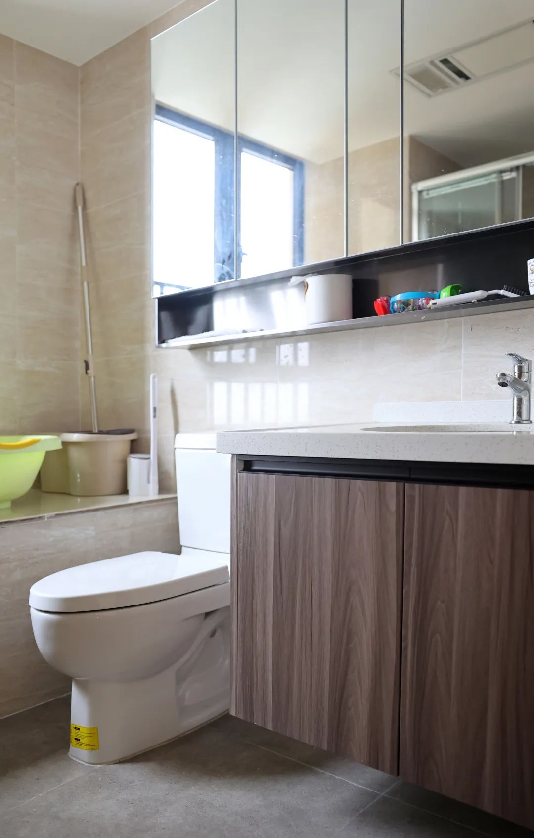 公卫洗手盆是白色的台面+台下盆的设计,下方柜是玄关同款木纹肌理,与整体装修风格保持一致,带来一种干净优雅的卫浴体验。