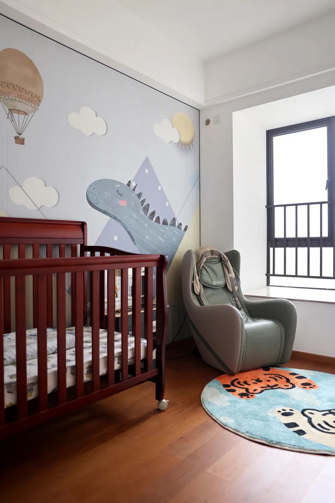 由于弟弟年纪太小,所以预留出来的小儿童房只摆放了一张婴儿床和一套鹰牌2086赠送的按摩椅。墙面的卡通定制彩绘十分夺人眼球,鹰牌2086硅藻泥科技墙板是低于国家标准规定的空间VOC及板材甲醛含量的,因此可有效杜绝甲醛、TVOC的释放,同时还具备防水防潮、抗菌抗敏、轻便快装等优越性能,就算用在婴儿房,也可以十分放心。