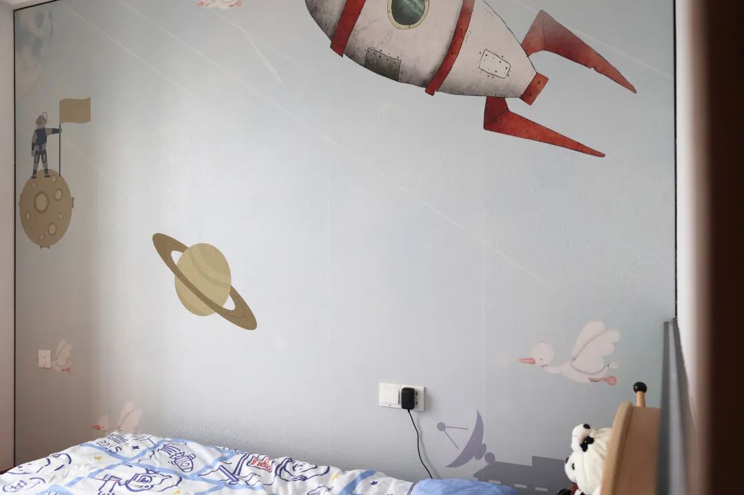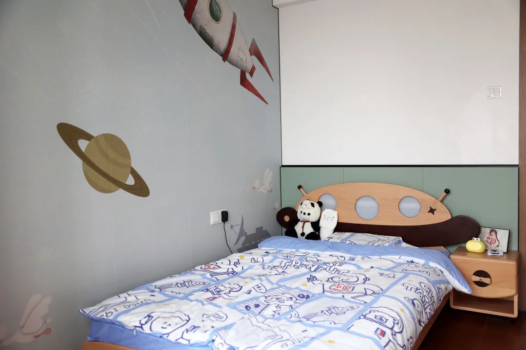 大儿童房的卧室背景墙采用星际奇航主题的定制喷绘,火箭、行星、宇航员,利用充满童趣的点缀,激起孩子对未知远方的好奇心与探索欲。可爱的床头造型和床头闹钟、卡通的床上摆件和床上用品,加上干净舒适的白色和充满生机的绿色组合而成的肤感护墙板,为孩子提供了一个活泼童趣而宽敞的成长空间。