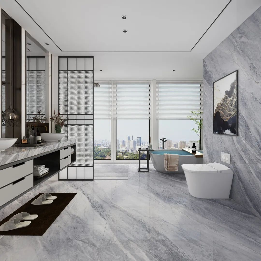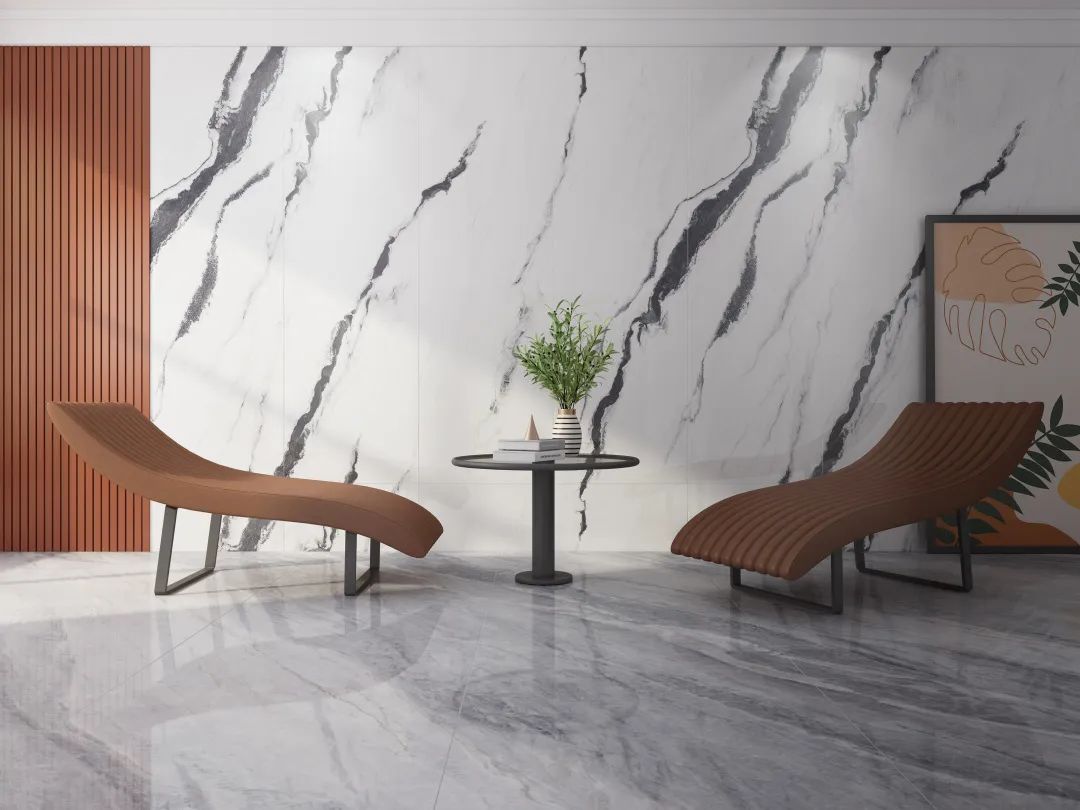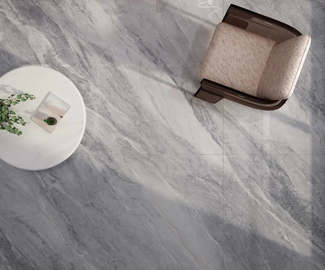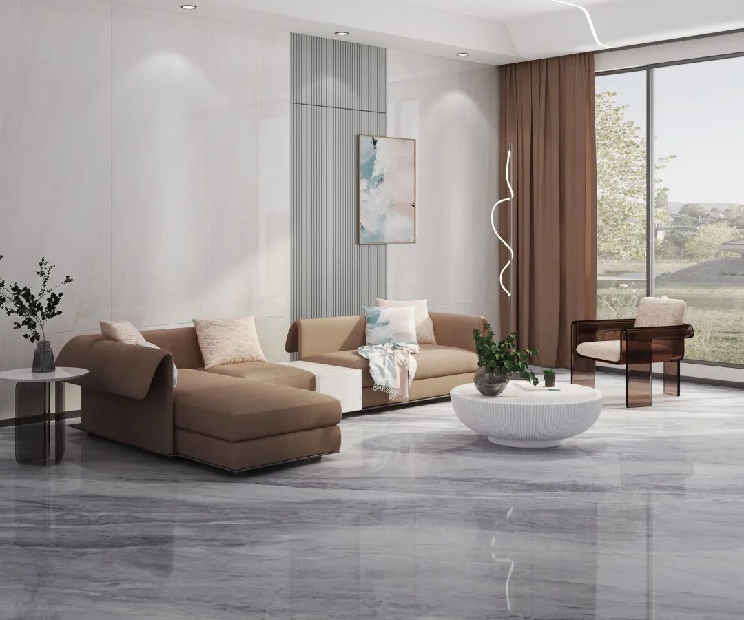 精细打磨抛光后瓷砖表面光泽度达到90°以上,呈现通透平整的质感,釉面清晰透亮。