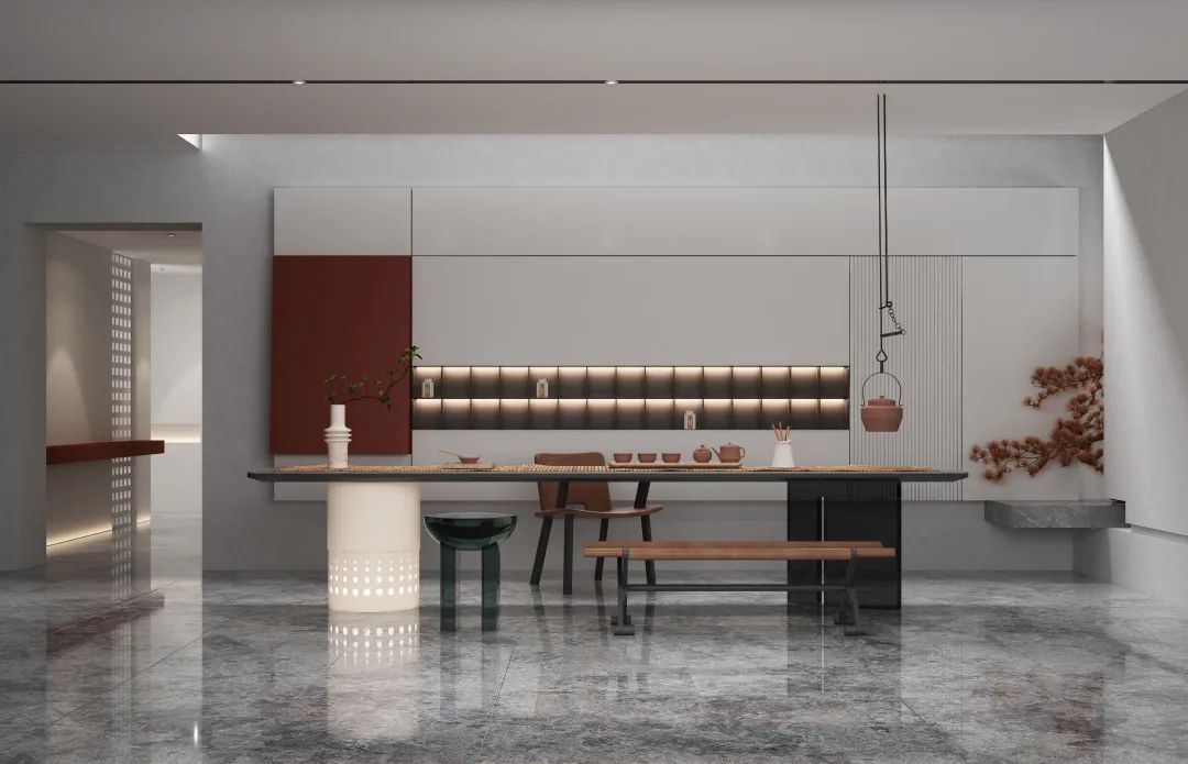 取古典黛色为基调,模仿群山重叠的走向,既有山脉的宽广,又有云雾的缥缈,打造沉稳大气的空间。
