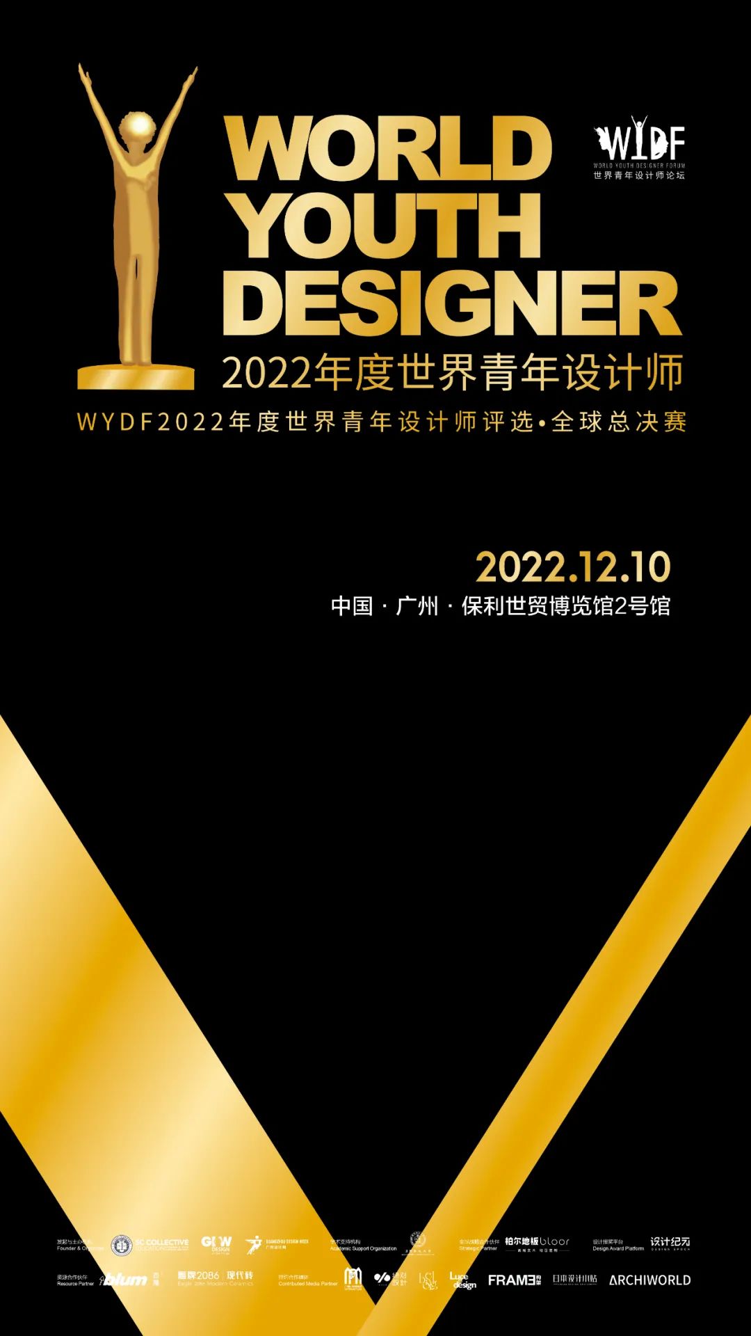 WYDF2022年度(大中华区)100大杰出设计青年颁奖典礼将于12月10日下午13:30在广州保利世贸博览馆2号馆论坛区隆重举行,并同期举办WYDF2022年度世界青年设计师评选•全球总决赛,来自欧洲、美洲、亚洲、大中华区的四位全球候选人将齐聚于此通过现场竞演评审方式角逐“WYDF2022年度世界青年设计师”的至高殊荣,敬请期待!