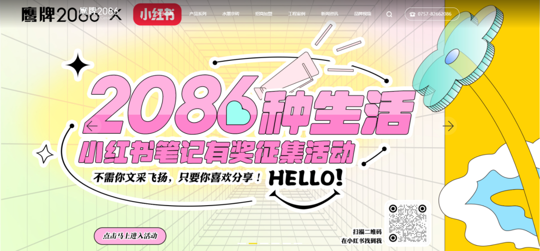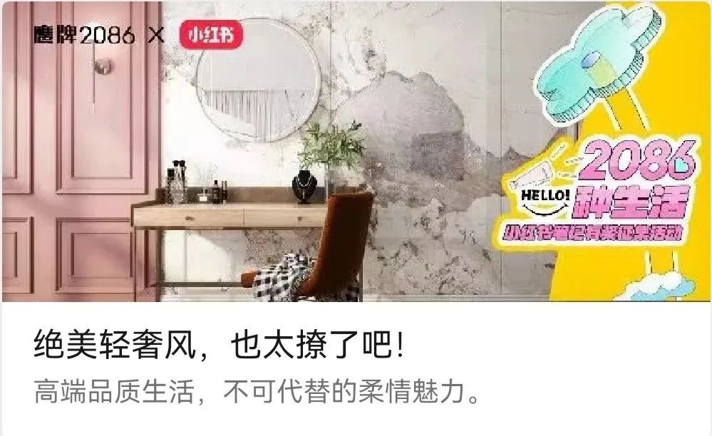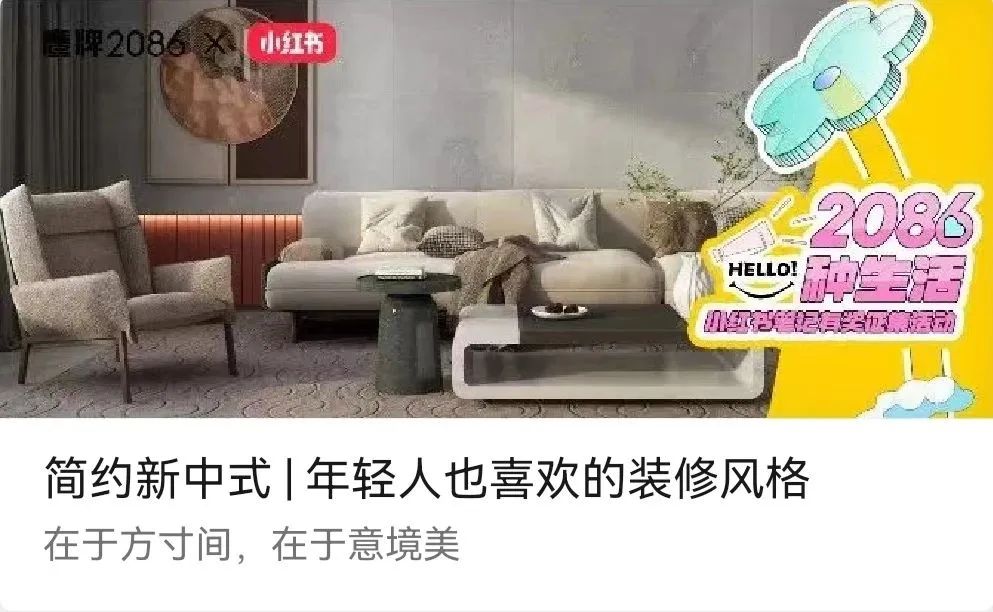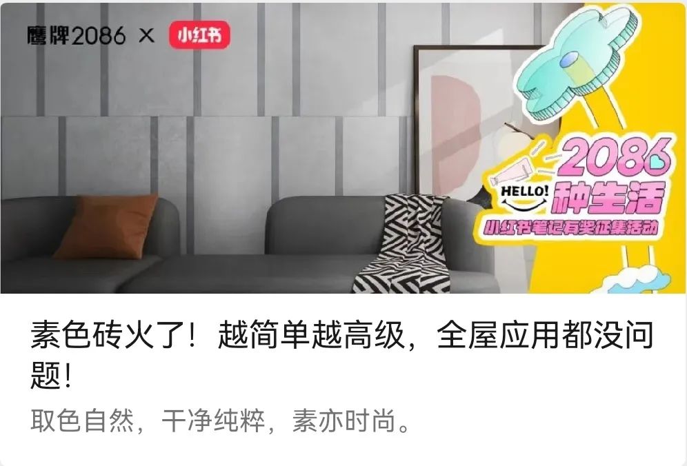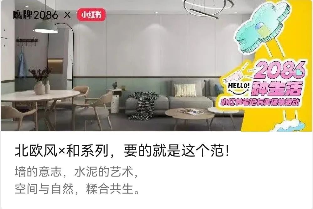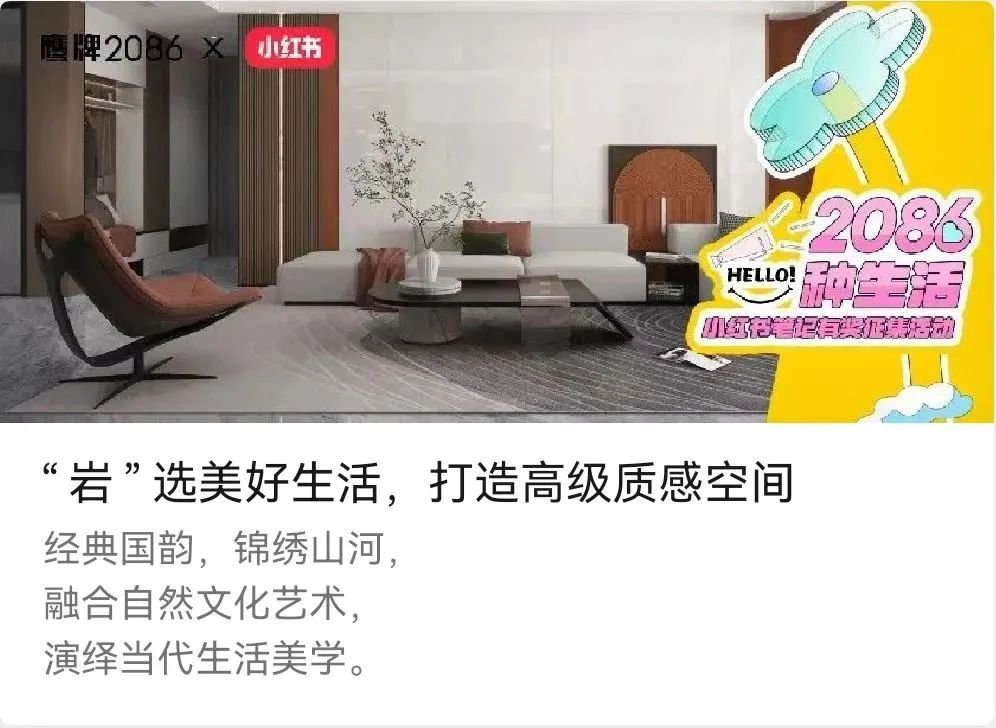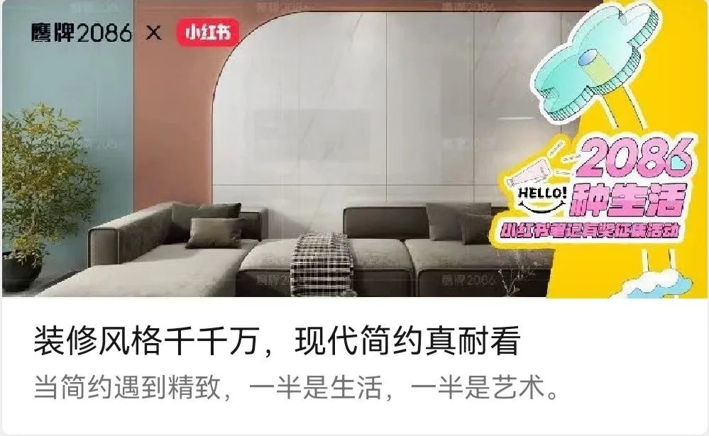 在此契机下,瓷砖一线品牌鹰牌2086以“2086种生活”为主题,发起了一场以家装案例为核心的小红书笔记有奖征集活动,不到三个月收集了超百份优秀案例,获得了1.5万浏览量。