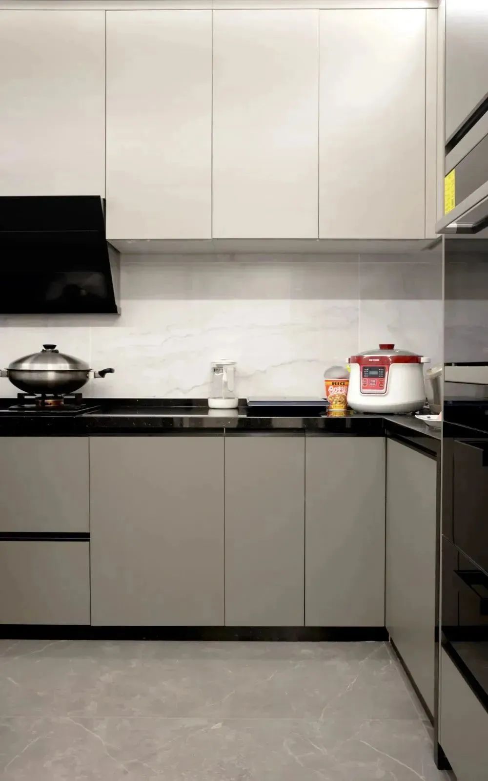 经典的黑白灰搭配永远不会出错,简约时尚的厨房采用U型橱柜台面布局,简化了操作时的动线,让日常使用更加方便快捷。