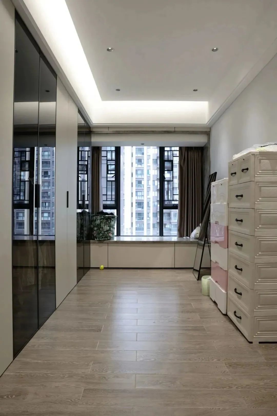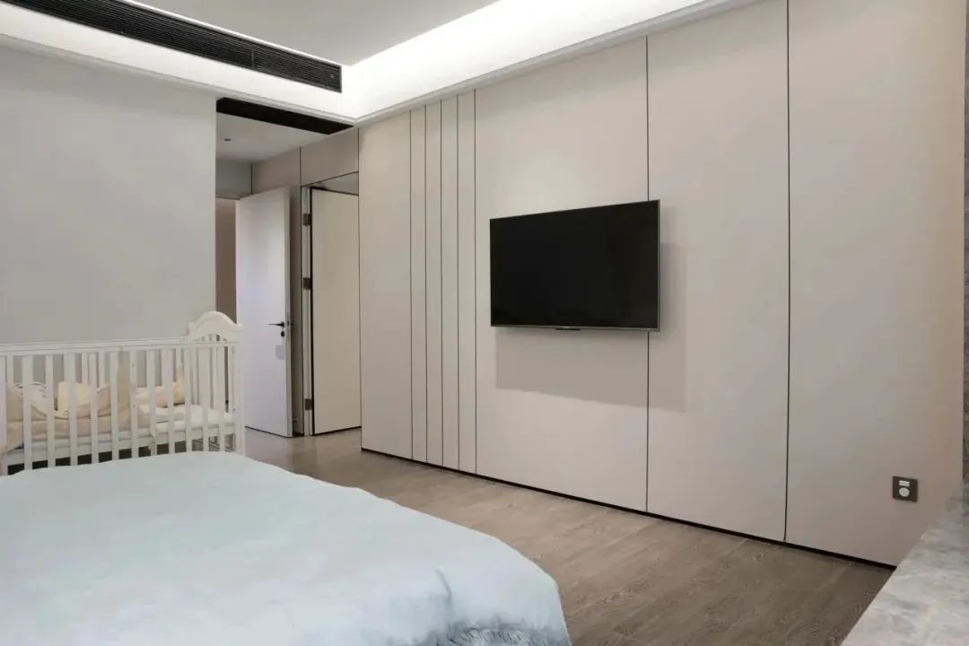 主卧空间较大,所以设计师将其划分为三个区域,卧室+衣帽间+卫生间三合一设计,提高了家里空间利用率。采用大面积的鹰牌2086护墙板和原木色的木纹砖,给人温暖舒适的感觉。