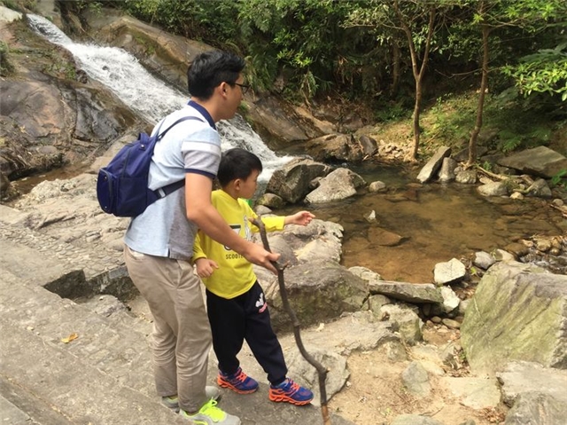 对儿子表面严厉,实则处处担心儿子安全的黄爸爸边登山边给儿子讲解大自然的鬼斧神工。