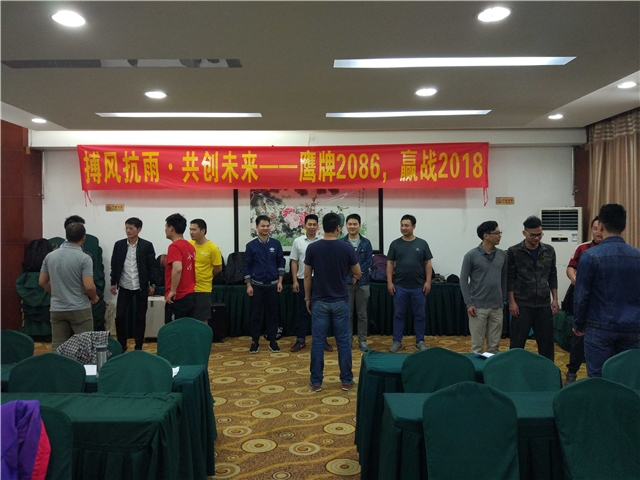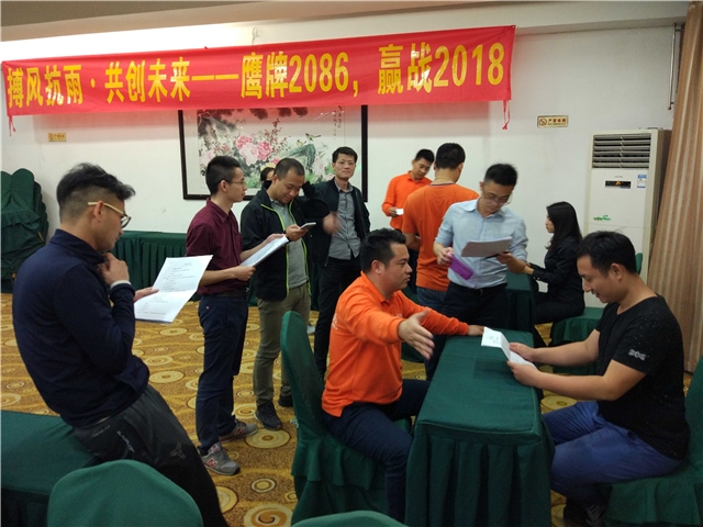 晚餐过后,召开了新一轮的会议,鹰牌2086营销中心总经理陈方根发表了关于2018年的品牌工作部署介绍,陈总总结了2017年的不足,宣布2018年的年度任务,从品牌推广、终端运营、品牌设计、品牌产品、营销政策等各个方面展开新一年的品牌战略部署,陈总表示:2018年是鹰牌2086至关重要的一年,也是鹰牌2086快速增长的一年,希望鹰牌2086的团队展现出高度的专业力、服务力、执行力与配合力,以客户为中心,以奋斗者为本,坚持艰苦奋斗,坚持自我批判。
